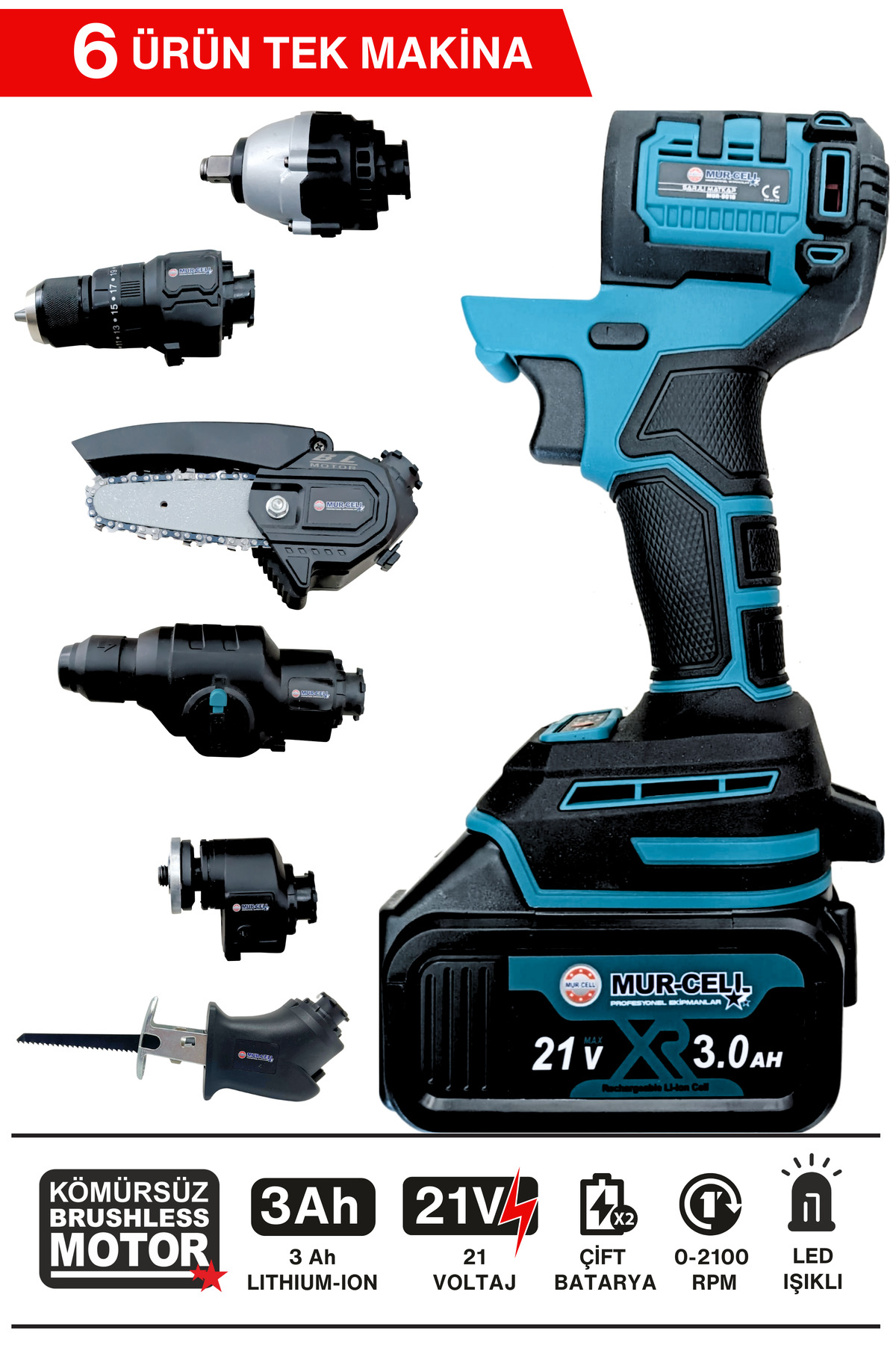 - 6 farklı kafa seçeneğiyle değişen ihtiyaçlarınıza uygun kullanım imkanı sunar.; - Tilki kuyruğu taşlama, darbeli vidalama ve kırıcı hilti işlevleri tek bir üründe bulunur, böylece birden fazla alet ihtiyacını ortadan kaldırır.; - Budama testeresi özelliği sayesinde bahçecilik ve ahşap işleme gibi çeşitli uygulamalar için idealdir.; - Matkap türü olarak darbeli mekanizması, zorlu yüzeylerde bile yüksek performans sağlar.; - 21 volt güçlü aküsü ile uzun süreli çalışma süresi sunarken, 3.0 - 3.4Ah kapasitesiyle enerji verimliliği artırılmıştır.; - Yetkili servis desteği ile tamiri yapılabilen bu ürün, güvenilir bakım ve onarım hizmetleri sunar.; - Takım çantasıyla birlikte gelmesi sayesinde kolay taşınabilirlik ve saklama imkanı sağlar.; - Çin menşeli üretim kalitesiyle dayanıklılık ve uzun ömürlülük vaat eder.; - 2 yıl garanti süresiyle satın alma sonrası güven verir ve müşteri memnuniyetini ön planda tutar.